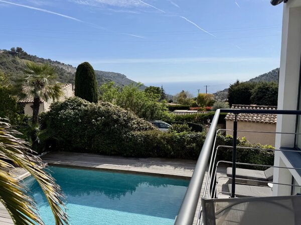 Located in a highly sought-after residential area, in absolute tranquility and only a 10-minute walk from the center of the village of La Turbie, this superb south-west facing villa enjoys a magnificent sea view, easy access, and complete privacy with no overlooking neighbors.