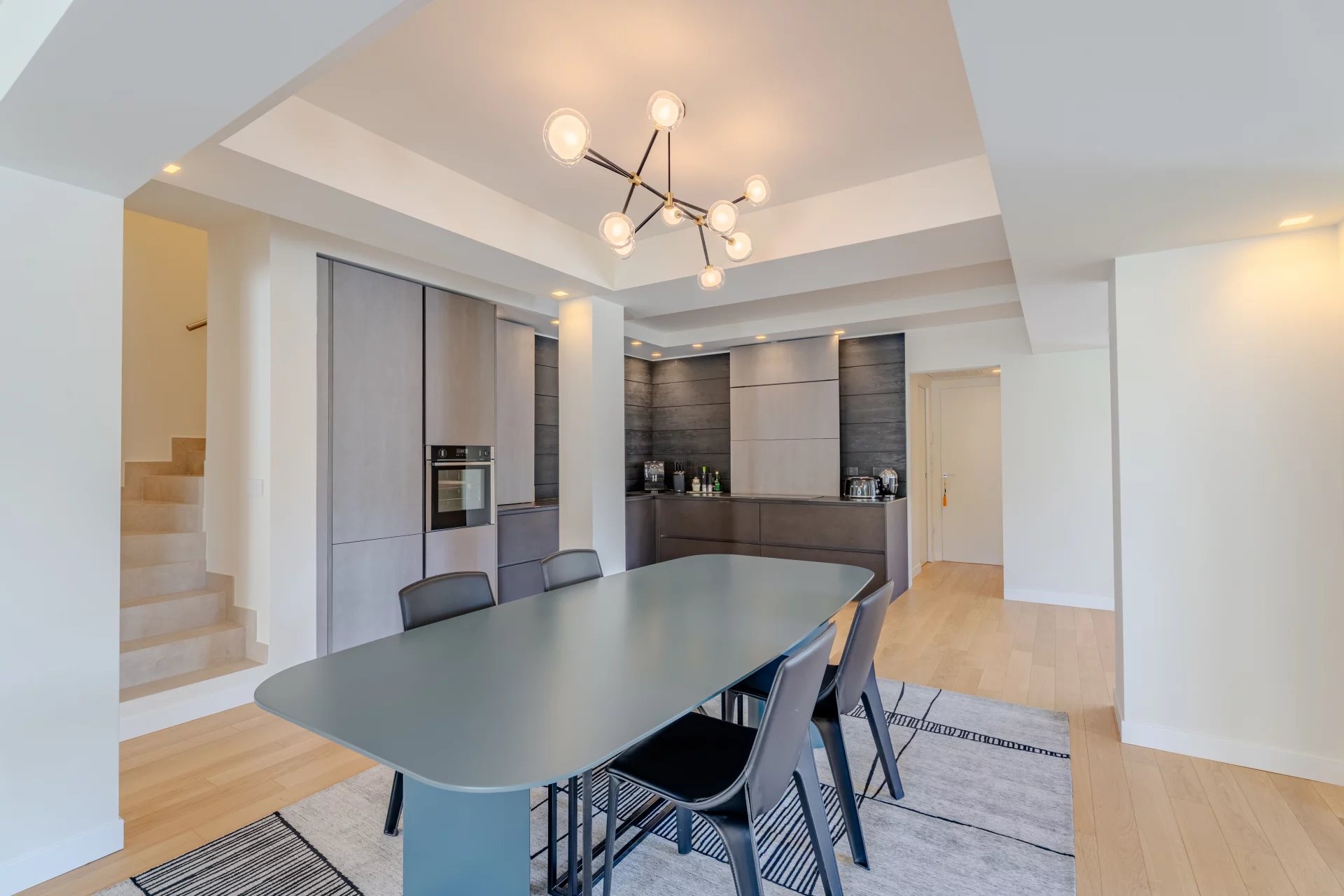 A bright and spacious living room, a contemporary fully equipped kitchen, an elegant dining area, one bedroom with its own shower room and toilet, a separate guest toilet, and a laundry room.
