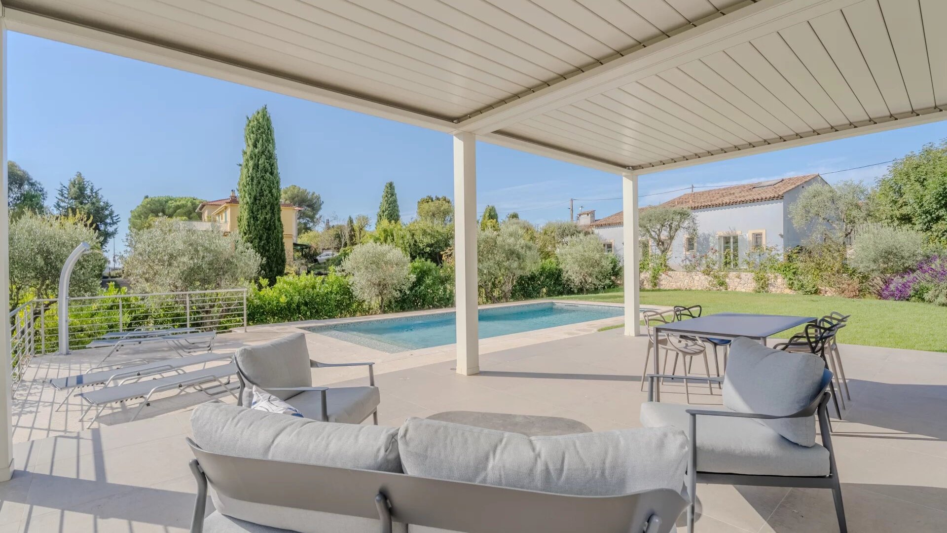 A landscaped garden, a modern-style swimming pool, a bioclimatic pergola with a summer lounge, and several parking spaces including a large covered one.