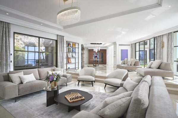 The villa accommodates up to 12 guests and features elegant contemporary interiors with generous reception areas, 6 bedrooms with terraces, and 8 bathrooms.