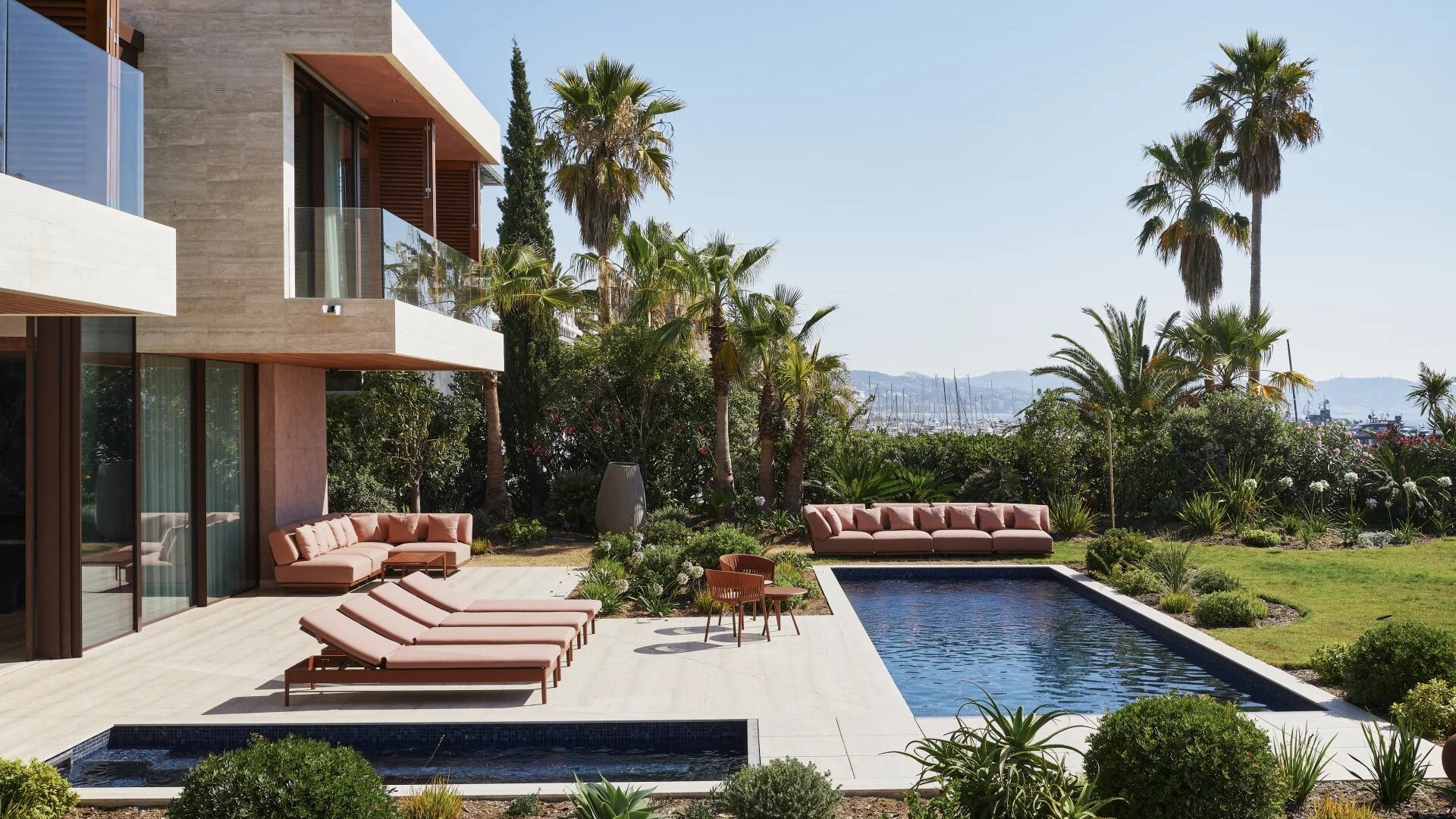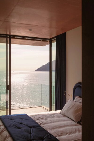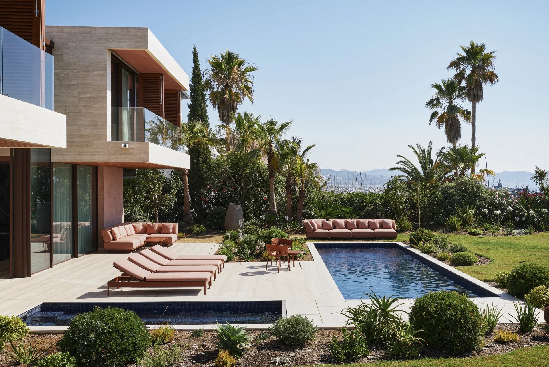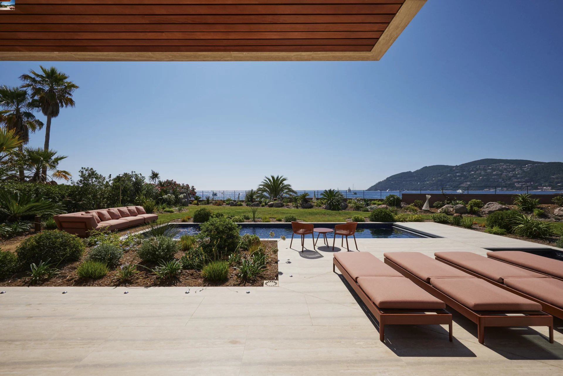 Its architectural signature elegantly blends noble materials such as ochre-toned pigmented concrete, walnut wood, Azul Bahia granite, and sipo wood, in perfect harmony with the natural colors and landscape of the Estérel.