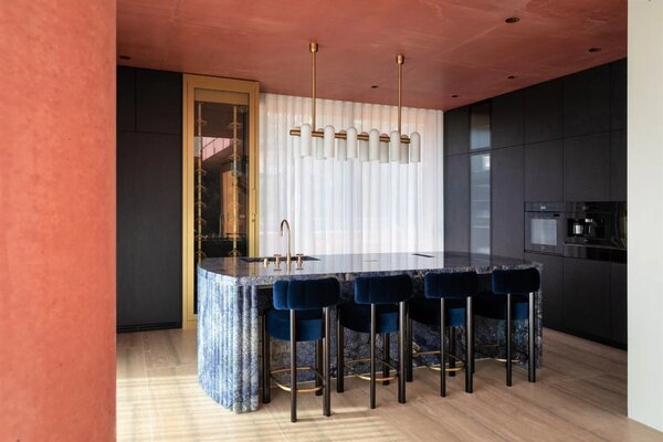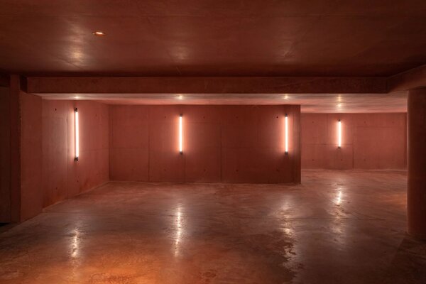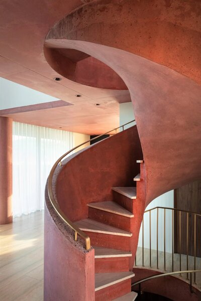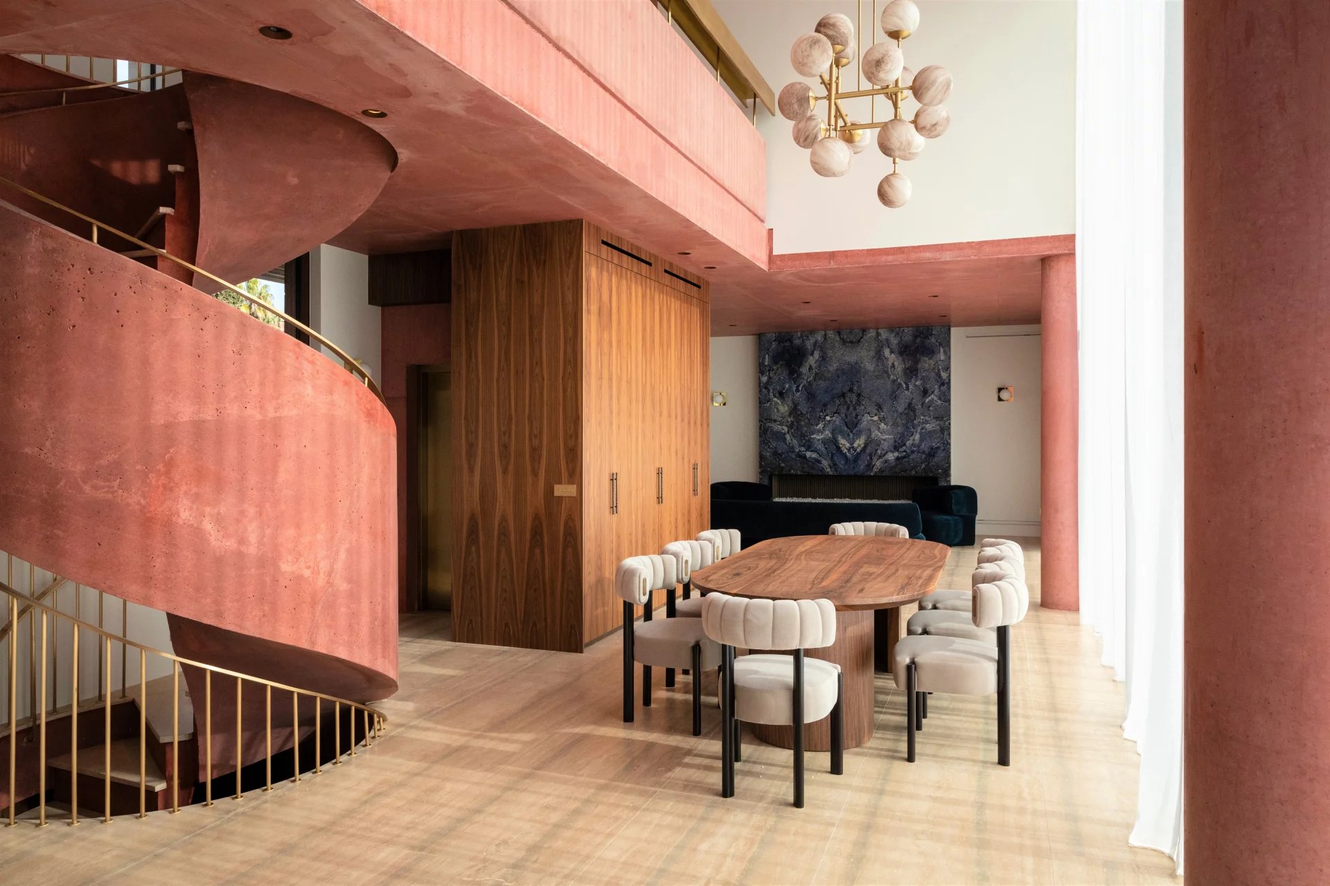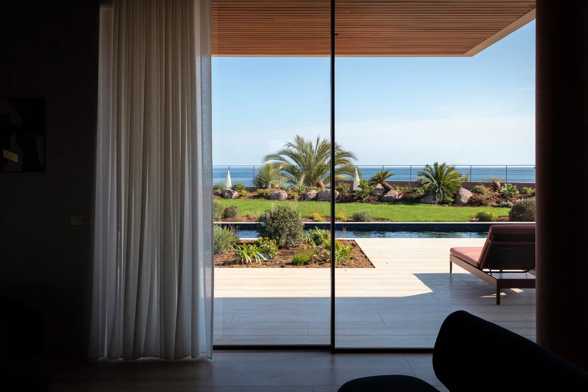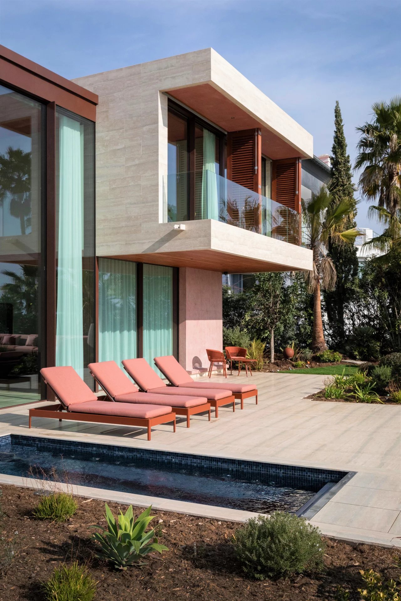 Its architectural signature elegantly blends noble materials such as ochre-toned pigmented concrete, walnut wood, Azul Bahia granite, and sipo wood, in perfect harmony with the natural colors and landscape of the Estérel.