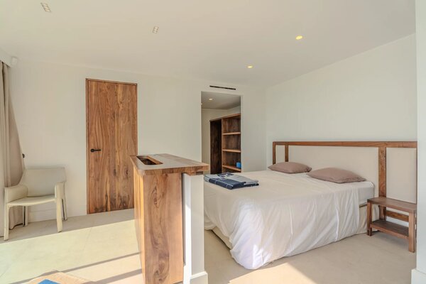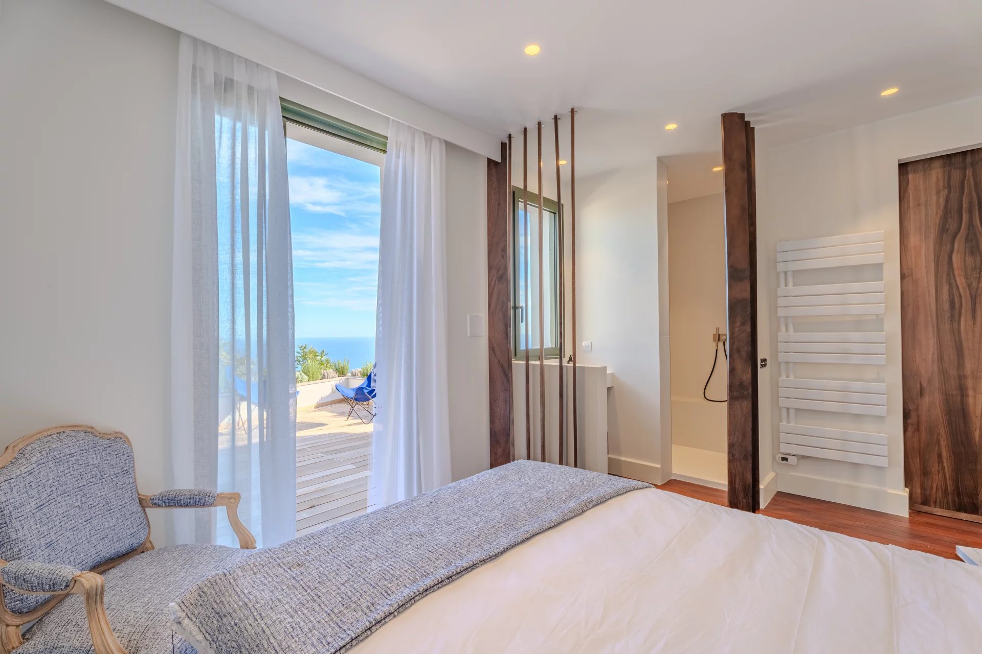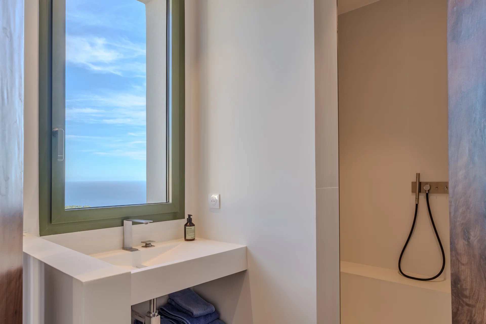 La suite parentale, offrant une vue mer époustouflante, bénéficie de sa propre salle de douche, complétée par deux chambres supplémentaires, chacune avec sa salle d’eau privative.